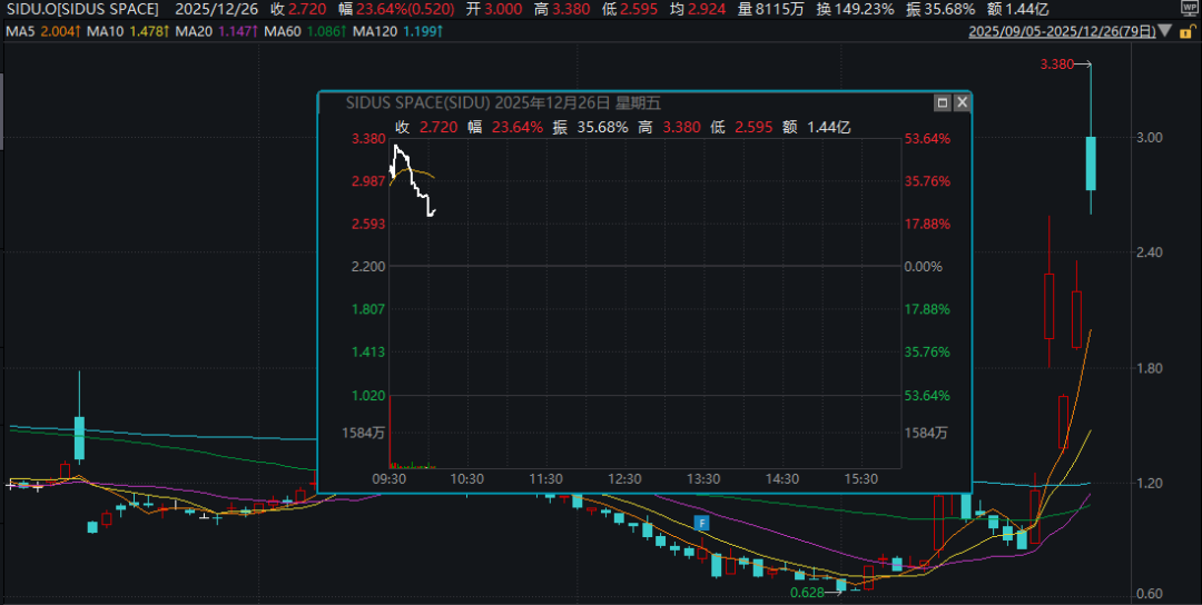 近几个交易日,Sidus Space股价大幅波动。12月19日,该股盘中一度涨超46%,收盘涨幅仍有35.67%;12月22日,该股盘中一度涨超120%,收盘涨96.98%;12月23日,该股盘中一度跌超40%,收盘跌27.95%;12月24日,Sidus Space重回涨势,盘中一度涨超40%,收涨33.33%。Wind统计数据显示,自12月19日以来,截至发稿,Sidus Space在5个交易日内涨幅超过210%。