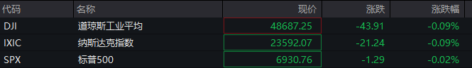 当地时间12月26日,美股三大指数盘初冲高后集体走低,截至发稿,道指跌0.09%,纳指跌0.09%,标普500指数跌0.02%。