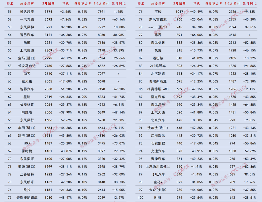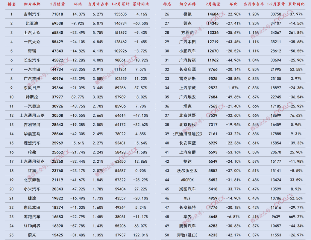 从榜单尾部来看,众多小众品牌销量不足千辆,市场份额持续萎缩。整体而言,2月车市呈现自主领跑、合资承压、新能源分化的核心特征,自主车企通过技术升级、品类扩张持续抢占市场,合资品牌加速分化,新能源赛道竞争加剧。随着消费升级与技术迭代,车市格局将进一步重塑,具备核心技术与品牌力的车企将在竞争中占据主动。